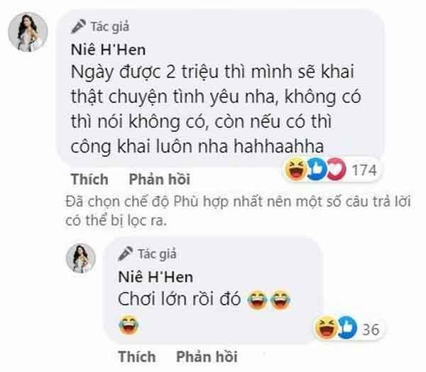 Không những vậy, dưới phần bình luận, mỹ nhân gốc Ê-đê còn khiến fans thích thú khi tuyên bố sẽ có thể công khai chuyện tình cảm cá nhân với một điều kiện: “Ngày được 2 triệu thì mình sẽ khai thật chuyện tình yêu nha, không có thì nói không có, còn nếu có thì công khai luôn nha… Chơi lớn rồi đó”.