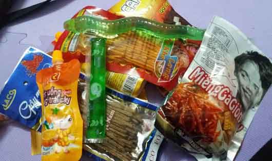 Còn nếu là các loại bánh kẹo, nước ngọt, bim bim, snack đóng gói sẵn thì phần lớn chúng có chữ Trung Quốc, một số ít chữ Thái, hoặc xuất xứ Việt Nam nhưng từ các cửa hàng gia công không có giấy phép và chưa qua kiểm định.