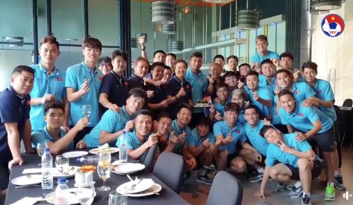Trước bữa ăn trưa, toàn đội đã tập trung và tặng bánh sinh nhật cho thủ môn Y Eli Niê. Sau màn cắt bánh, tân binh của U.23 Việt Nam được HLV Park Hang-seo tặng một bì thư.