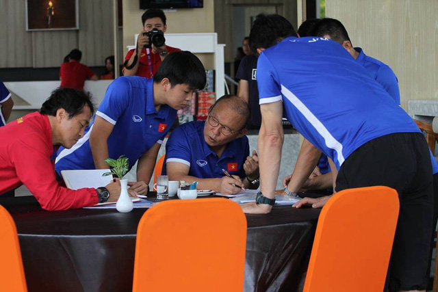 Vào trưa nay, trong khi các học trò ra sân phía trước khách sạn để khởi động, HLV Park Hang Seo cùng các thành viên ban huấn luyện họp bàn phương án tác chiến, và cùng nhau chọn ra đội hình tối ưu nhất với lối chơi tấn công ở trận mở màn.
