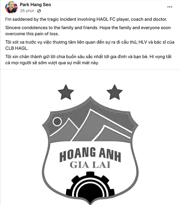 Trên trang cá nhân, HLV Park Hang-seo gửi lời chia buồn: “Tôi xót xa trước vụ việc thương tâm liên quan đến sự ra đi cầu thủ, HLV và bác sĩ của CLB HAGL. Tôi xin chân thành gửi lời chia buồn sâu sắc nhất tới gia đình và bạn bè. Hy vọng tất cả mọi người sẽ sớm vượt qua sự mất mát này”.