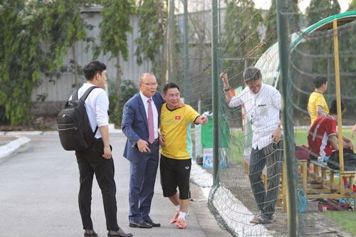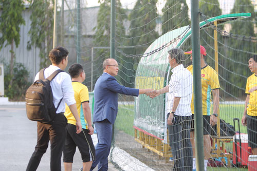 HLV Park Hang Seo sau đó ra chào hỏi và động viên U19 Việt Nam. Tại đây ông chào hỏi Hoàng Anh Tuấn và các cộng sự. Ảnh: Nguyễn Nam.