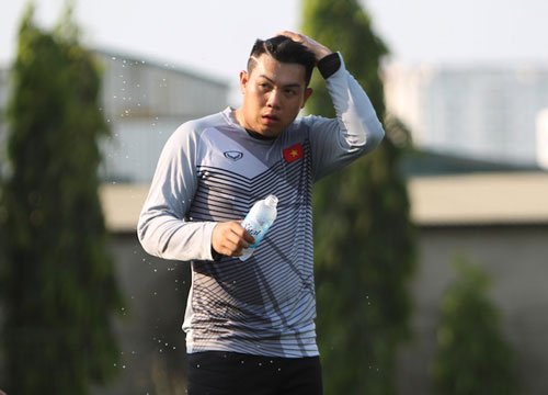 Nước luôn là thứ mà các cầu thủ quan tâm trong điều kiện tập luyện nắng nóng. Ảnh: M.Hùng.