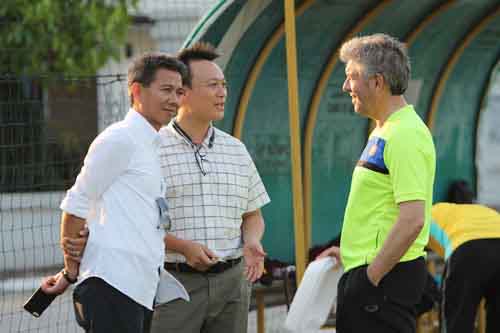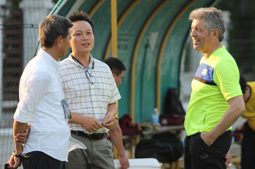 Trong khi đó HLV Hoàng Anh Tuấn có những trao đổi với GĐKT Gede. Ảnh: Nguyễn Nam.