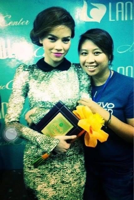 Ca sĩ Hồ Ngọc Hà chụp hình kỷ niệm với người viết Thủy Trần