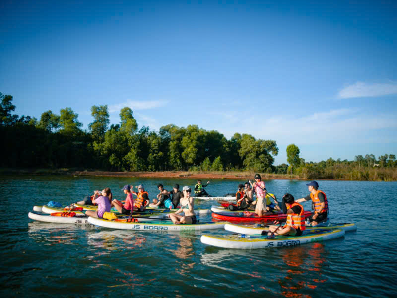 Buổi chiều, tôi được trải nghiệm chèo thuyền sup quanh hồ Trị An– một hoạt động khá là mới lạ và thú vị mà lần đầu tiên tôi được thử. Khi vừa bước lên thuyền, tôi vô cùng hồi hộp và lo lắng, không biết phải làm sao. Cảm giác chông chênh như mất đi điểm tựa, tay thì run, tim đập thình thịch. Tôi loay hoay khua mái chèo loạn xạ làm nước bắn tung lên, chiếc thuyền quay vòng tròn rồi mất thăng bằng làm tôi suýt nữa thì rơi xuống nước. Cảm giác thật hú hồn. May sao được anh chàng đồng nghiệp đi cùng hỗ trợ và hướng dẫn, tôi bắt đầu lấy lại bình tĩnh và tự tin hơn. Tôi thả lỏng cơ thể, giữ lưng thẳng, dùng mái chèo hai đầu đẩy thuyền đi xuôi theo dòng nước, chiếc thuyền lênh đênh, lướt đi nhẹ nhàng. Sau một hồi cố gắng thì thuyền cũng cập bờ. Cảm giác hạnh phúc chợt vỡ oà, tôi cảm thấy vui vẻ và hào hứng như vừa chinh phục được điều gì đó thật tuyệt vời.