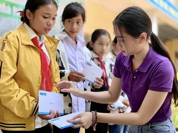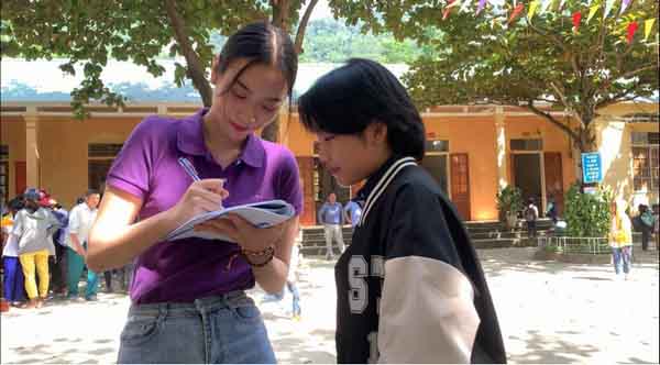 Hoa hậu Ban Mai trao tiền hỗ trợ học sinh Trường Phổ thông dân tộc bán trú tiểu học và THCS Tà Cạ, huyện Kỳ Sơn, Nghệ An.