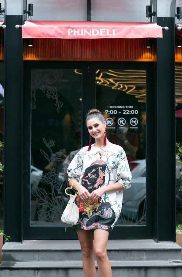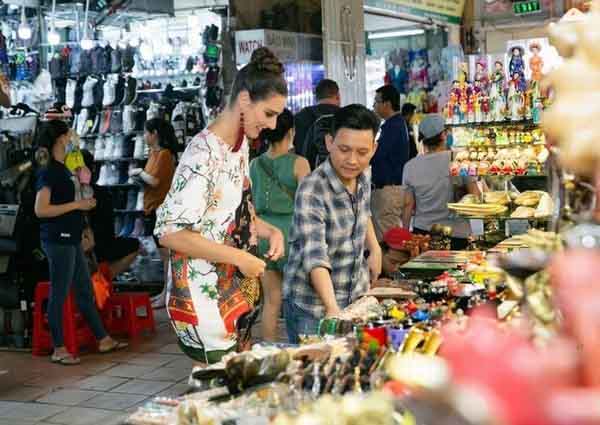 Tiếp đến, cô chọn chợ Bến Thành để mua sắm những món quà cho bạn bè và người thân. Bộ trang phục của nhà thiết kế Hà Linh Thư đã giúp cô khoe được cặp chân dài thon thả. Màu sắc hoạ tiết trên áo thuần Việt đầy tươi sáng giúp Hoa hậu thành tâm điểm mỗi nơi đi qua.