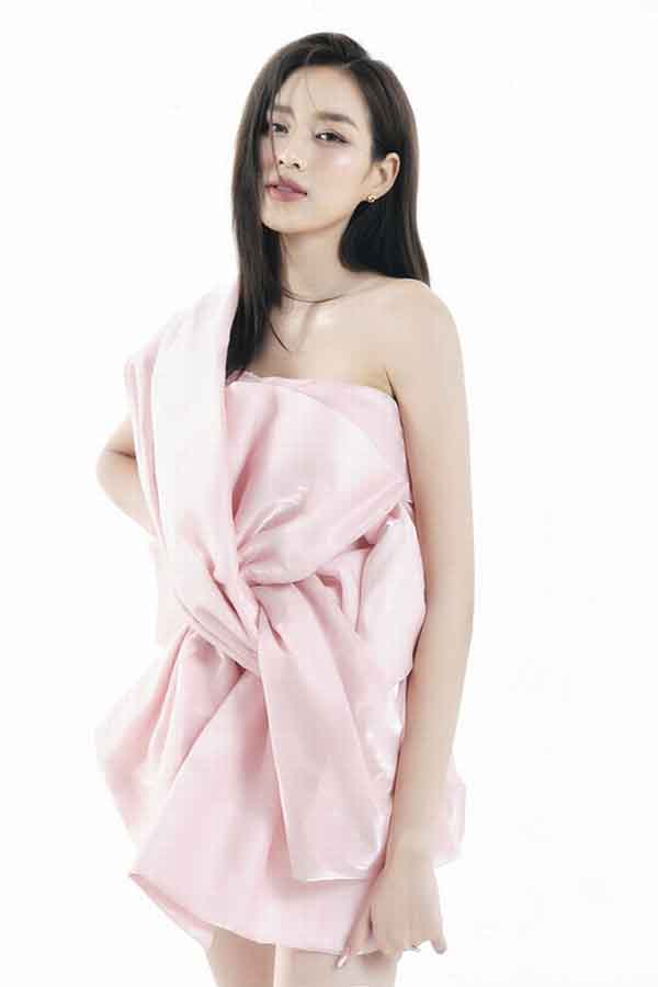 Chân dài sinh năm 2001 chọn một chiếc đầm hồng pastel lệch vai gợi cảm. Thiết kế này giúp người đẹp khoe triệt để đôi vai trần quyến rũ cùng vẻ ngọt ngào của Đỗ Thị Hà.
