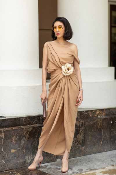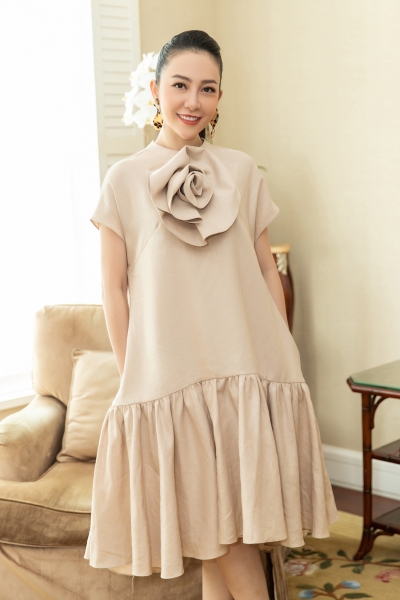 Nghệ sĩ múa Linh Nga nhẹ nhàng, duyên dáng khi chọn diện chiếc đầm freesize với phần hoa 3D to bản ấn tượng.