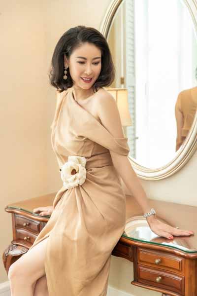 Trong sinh nhật 43 tuổi, Hà Kiều Anh mặc váy phom bất đối xứng, xẻ tà và nhấn hoa ở eo. Hoa hậu Việt Nam 1992 trông ấn tượng, quyến rũ với sắc môi đỏ tươi.