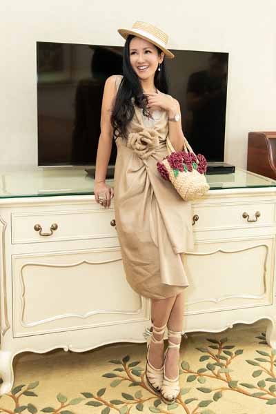 Ca sĩ Hồng Nhung cũng là một trong những người bạn thân thiết của Hoa hậu Hà Kiều Anh. Cô diện váy màu be điểm thêm chất liệu ren tông trắng kết hợp với túi cói phong cách.