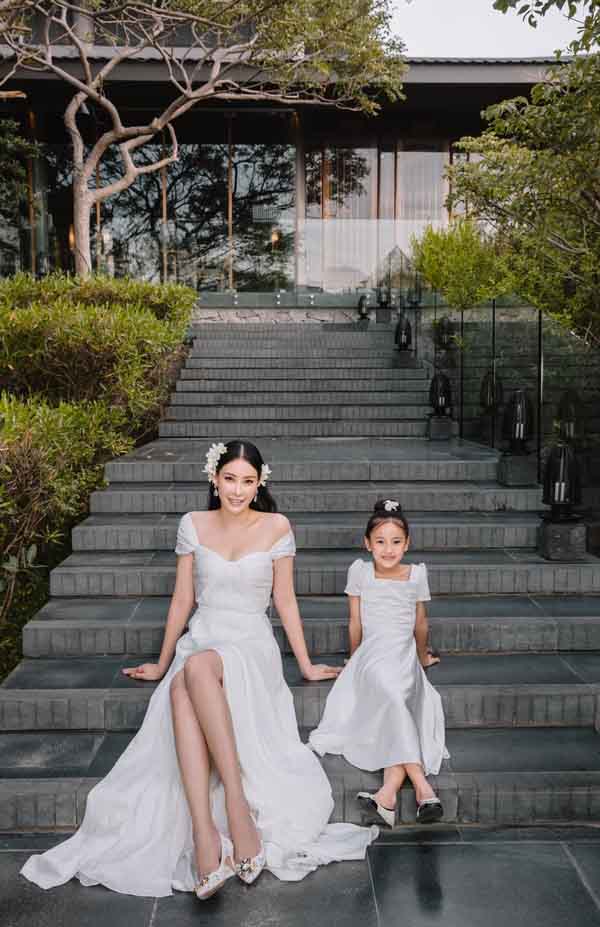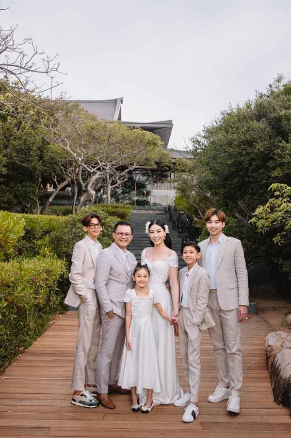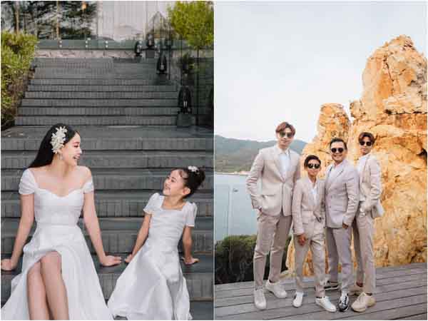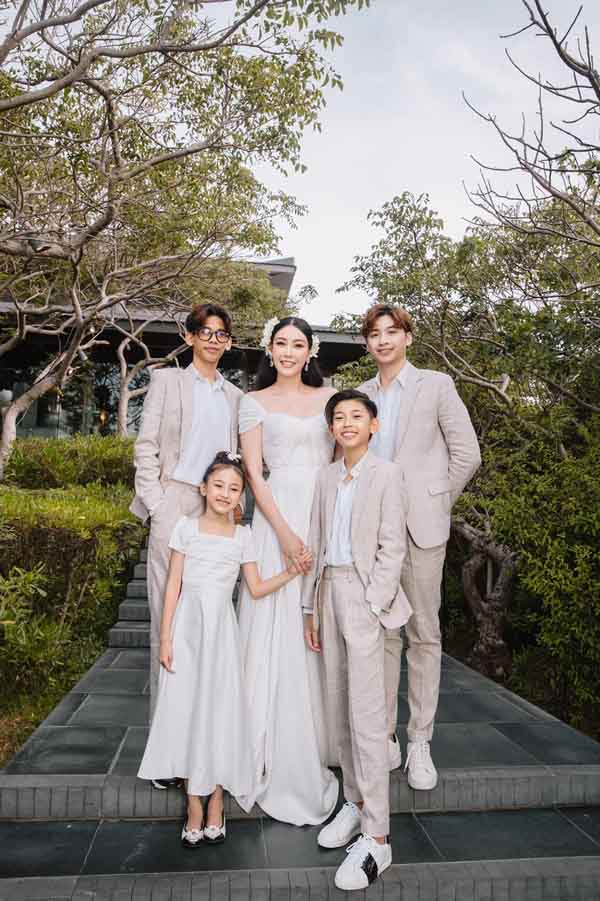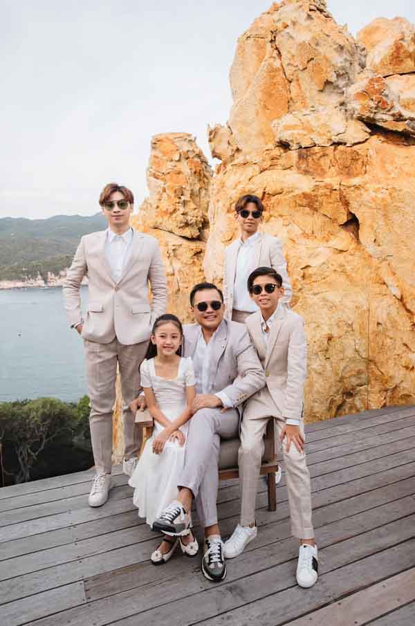 Trong khi Hoa hậu Hà Kiều Anh và cô con gái út mặc váy trắng tinh khiết thì ông xã của cô – doanh nhân Huỳnh Trung Nam và các cậu con trai mặc vest bảnh bao, lịch lãm.
