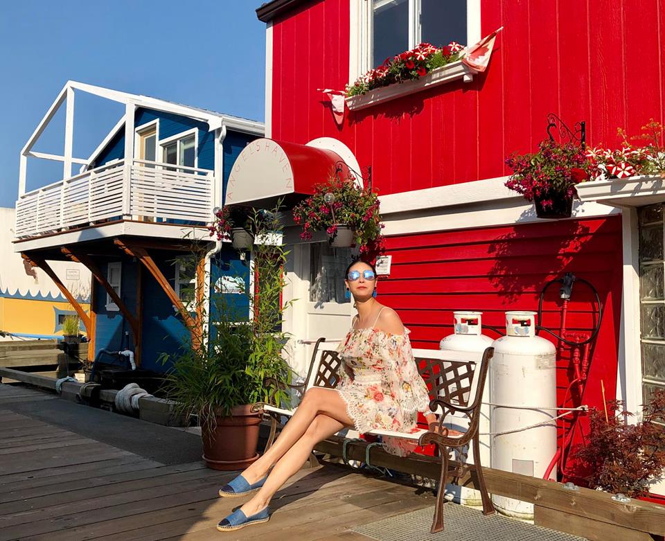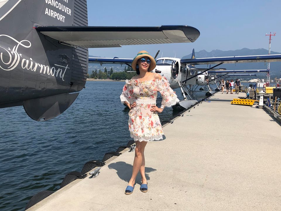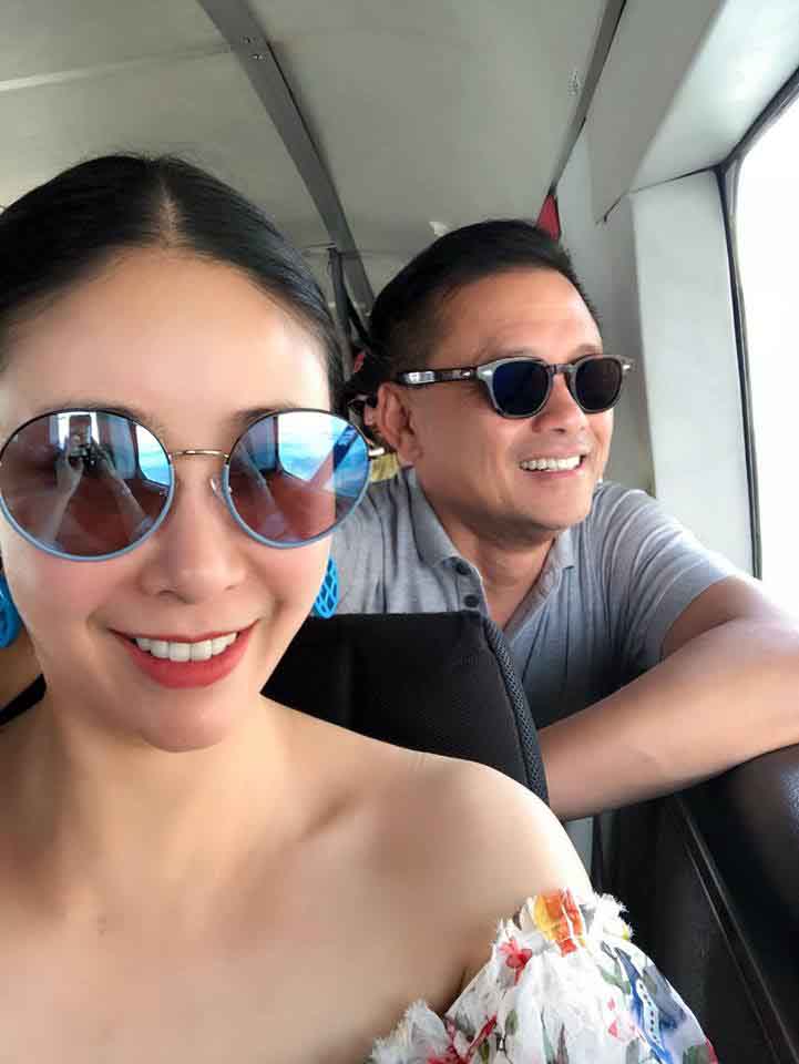 Mới đây, bà mẹ ba con chia sẻ những hình ảnh tạo dáng cạnh thủy phi cơ trên trang facebook cá nhân kèm theo dòng chú thích khen ngợi khả năng chụp ảnh của ông xã đại gia:“Lần đầu tiên mình được đi thuỷ phi cơ và được một ngày thảnh thơi uống trà, dạo phố. Chỉ tội anh chồng nhăn nhó phải thành photographer bất đắc dĩ giúp vợ chụp hình. Không có bọn trẻ hò hét bên cạnh lại thấy thiếu thiếu âm thanh gì đó nhỉ”.