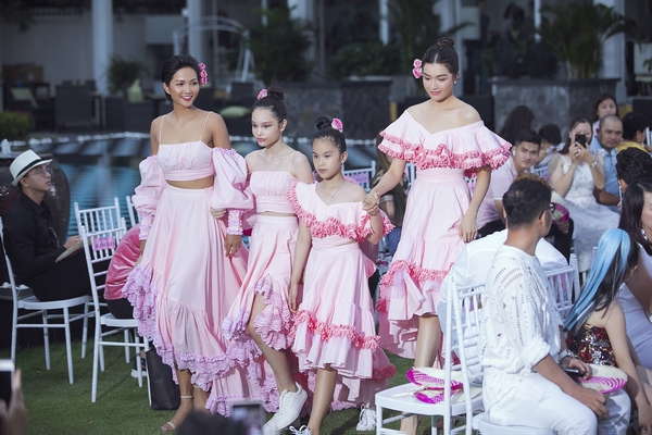 Đặc biệt, cả hai cùng là vedette, khoác lên người bộ cánh tông hồng chủ đạo, hồn nhiên, duyên dáng sải bước cùng các bé người mẫu nhí.