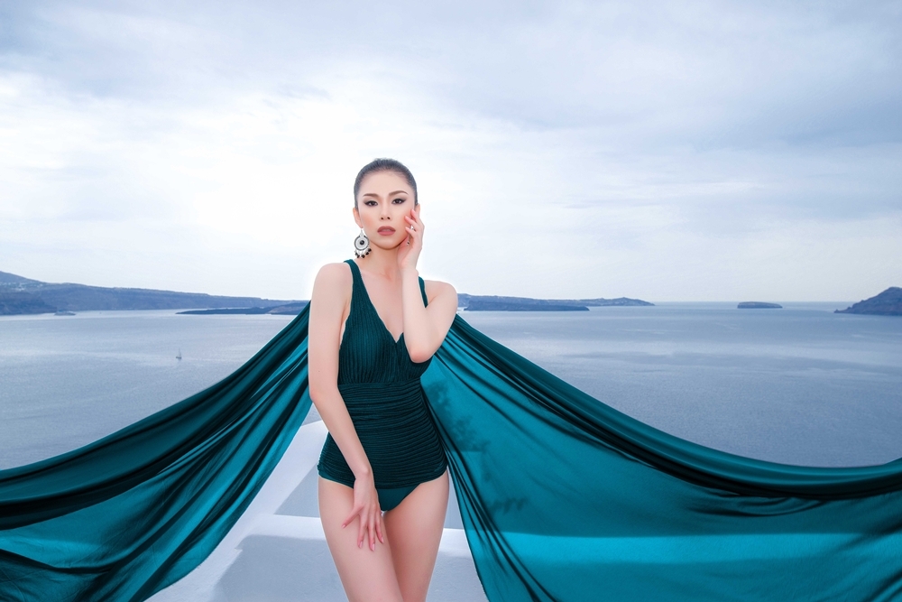 Nhà thiết kế đã thực hiện cho cô những bộ áo tắm màu xanh ngọc để phù hợp với không gian biển trời.