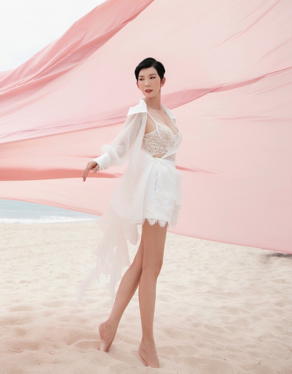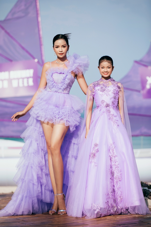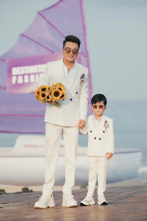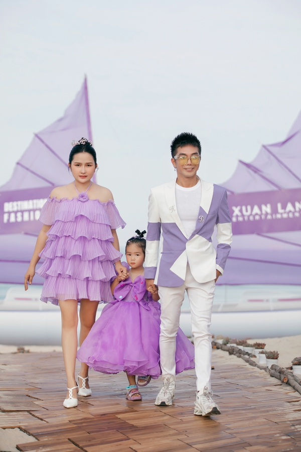 Ca sĩ Khánh Đơn cùng vợ Huỳnh Như và con gái 4 tuổi – Đồng Đồng kết màn BST “Pisces – Song Ngư” cũng khiến đông đảo khách mời thích thú. Cả gia đình cùng cười rạng rỡ, hạnh phúc dắt tay nhau bước đi trên sàn diễn dài 200m bên bờ biển. Đặc biệt, tại điểm cuối cùng của đoạn đường, khán giả xuýt xoa tan chảy với khoảnh khắc cựu thành viên nhóm nhạc Huyền Thoại được nhóc tỳ nhà mình tình cảm choàng tay ôm để hôn má.