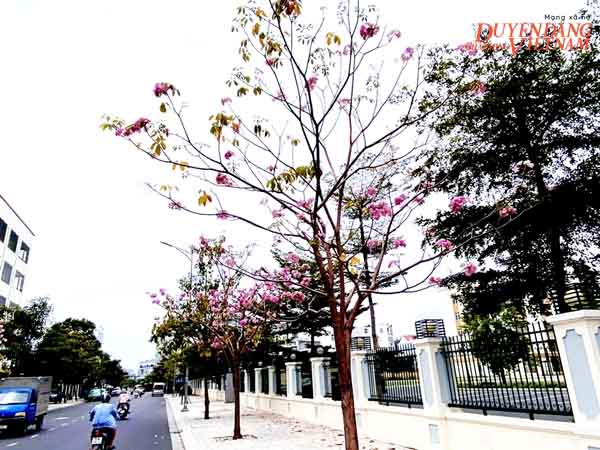 Hoa kèn hồng nở bung suốt cả con đường, những cánh hoa rơi xuống tạo ra những thảm hoa vô cùng dẹp đẽ.