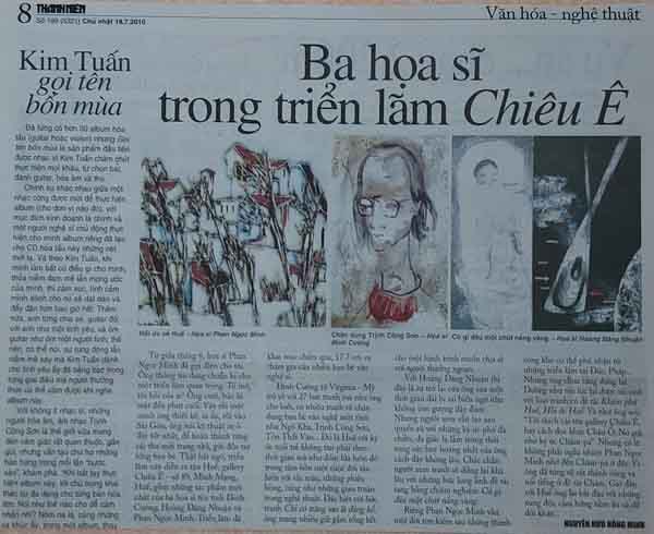 Bài viết “Ba họa sĩ trong triển lãm Chiêu Ê” viết về triển lãm tranh của ba họa sĩ Đinh Cường, Hoàng Đăng Nhuận, Phan Ngọc Minh của nhà thơ, nhạc sĩ Nguyễn Hữu Hồng Minh trên báo Thanh Niên số 199 ra ngày Chủ nhật, 18.7.2010.