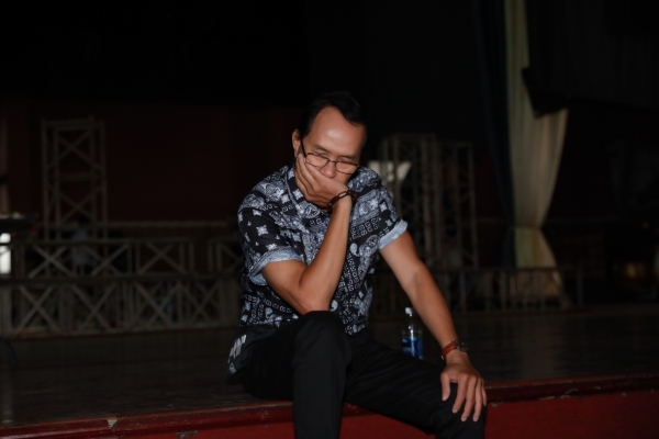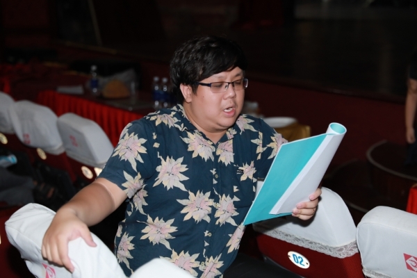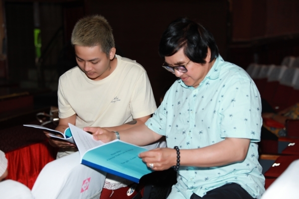 Lần đầu tiên tham gia một vở cải lương kinh điển như Lan và Điệp, Hoài Lâm ăn mặc giản dị và chăm chú lắng nghe sự chỉ dẫn tận tình từ những bậc tiền bối.