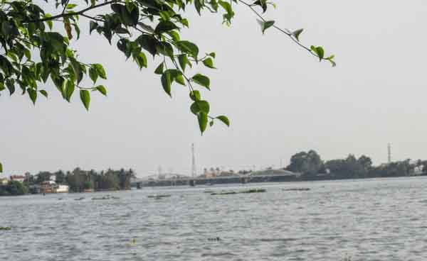 Cù Lao Phố chiều buông muồn muộn. Bóng hoàng hôn phủ xuống. Một vùng sông nước mênh mang níu bước người đi. Bên đường từng hàng cây rủ bóng. Phía mạn sông hương lúa đương thì con gái hòa quyện với khói chiều của cư dân bản địa thấp thoáng ẩn hiện. Đứng từ phía bờ Bắc nhìn về hạ lưu. Xa xa là núi Châu Thới và dải đất Bình Dương chạy dọc bến sông với san sát thuyền bè qua lại. Con nước lớn đang lên đẩy theo từng đám lục bình dập dờ trôi ngược theo dòng mênh mang. Bên dưới là cầu Ghềnh, cây cầu có cả gần trăm năm tuổi. Mấy năm trước sau một sự cố va chạm giao thông tàu thuyền, cầu hư hỏng nặng. Ngành đường sắt Việt Nam cho trùng tu lại với hình dáng, kích thước, màu sơn y như cũ.
