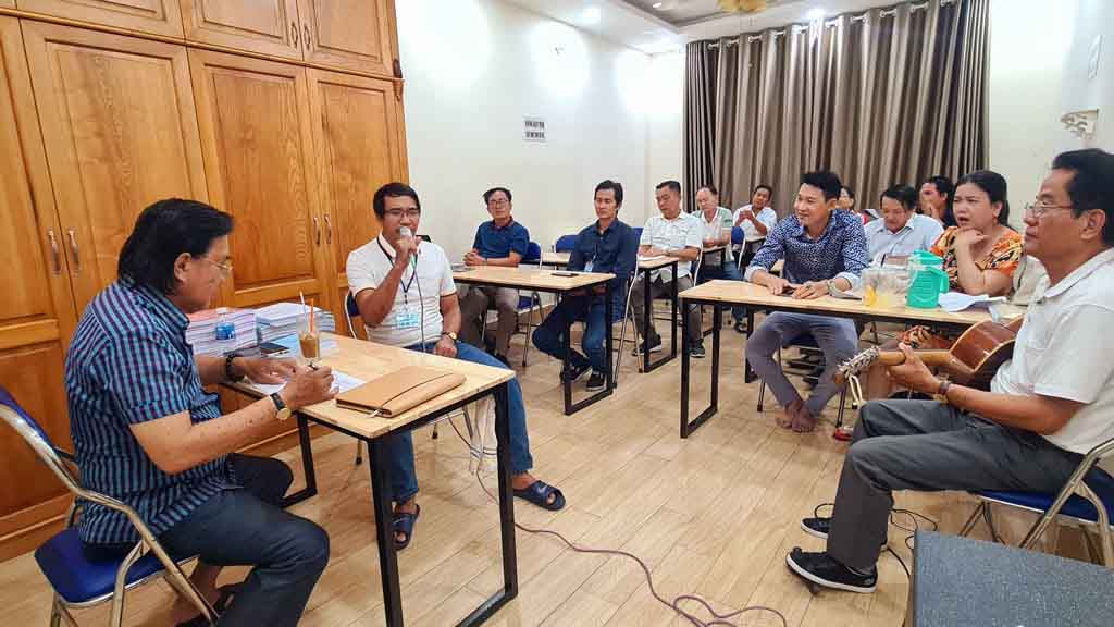 NSND Thanh Tuấn (bìa trái) đang dạy ca vọng cổ cho lớp học của mình