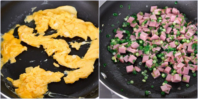 Cho thìa canh bơ còn lại vào chảo. Sau đó thêm thịt heo đóng hộp và hành lá đảo đều tay đến khi có mùi thơm dậy lên. Lúc này cho cơm vào chảo. Bạn nên đảo cơm đều tay và làm tơi những phần cơm bị vón cục.