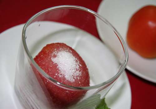 – Cắt đôi cà chua, cho đường cát trắng vào.