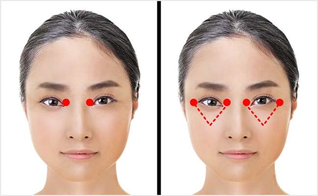 Đặt ngón tay trỏ tại phần hốc mắt gần sống mũi, kéo ngón trỏ tạo thành góc vuông đến đuôi mắt. Hoặc bạn có thể đặt ngón trỏ tại hai hốc mắt, hai ngón giữa ở phần đuôi mắt, nhấn đồng thời hai điểm hốc mắt và đuôi mắt.