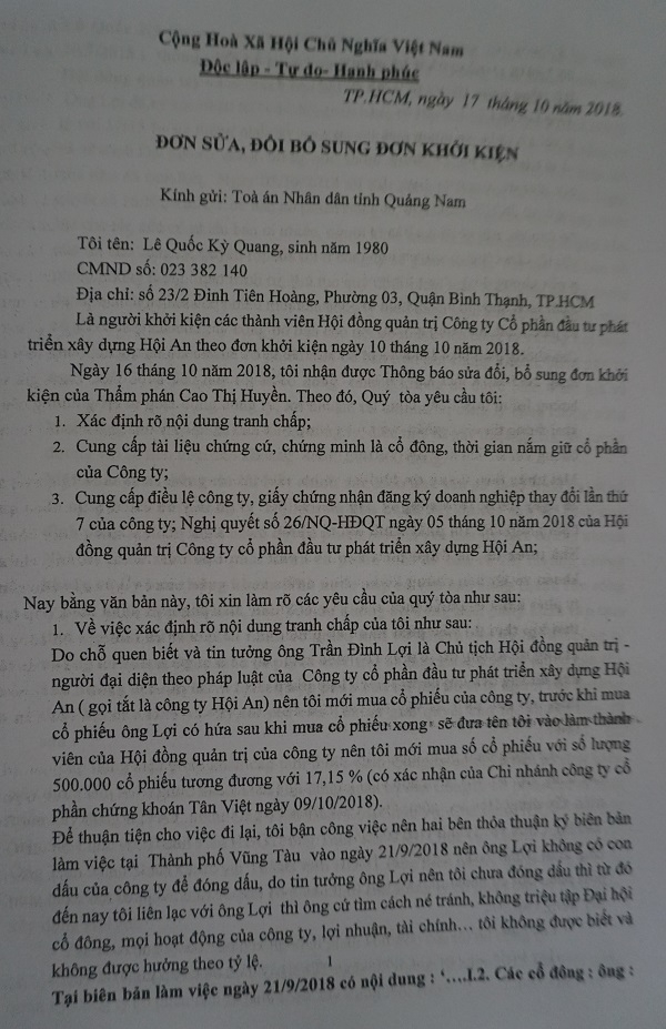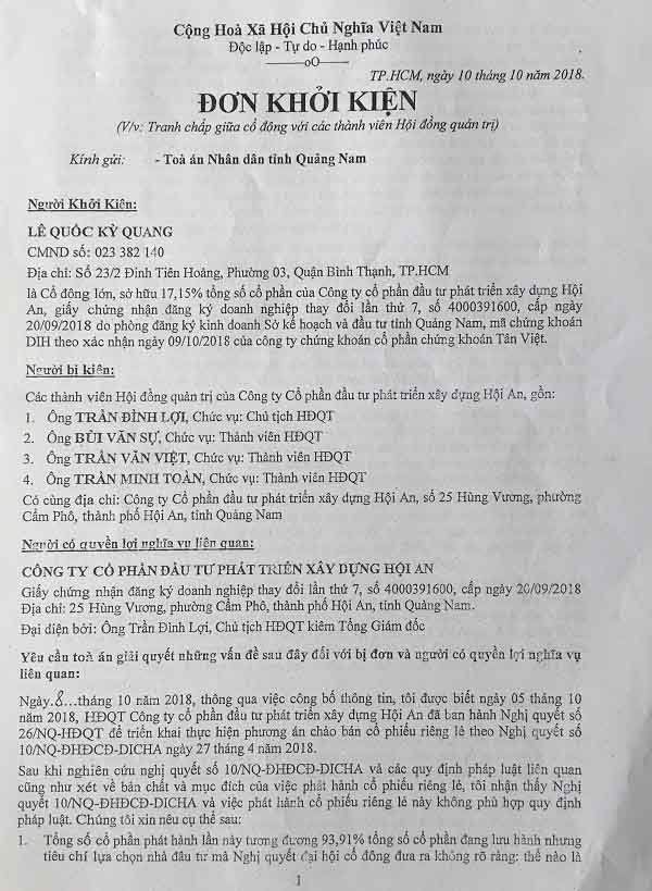 Đơn khởi kiện của ông Lê Quốc Kỳ Quang kiện các thành viên Hội đồng quản trị DIC Hội An