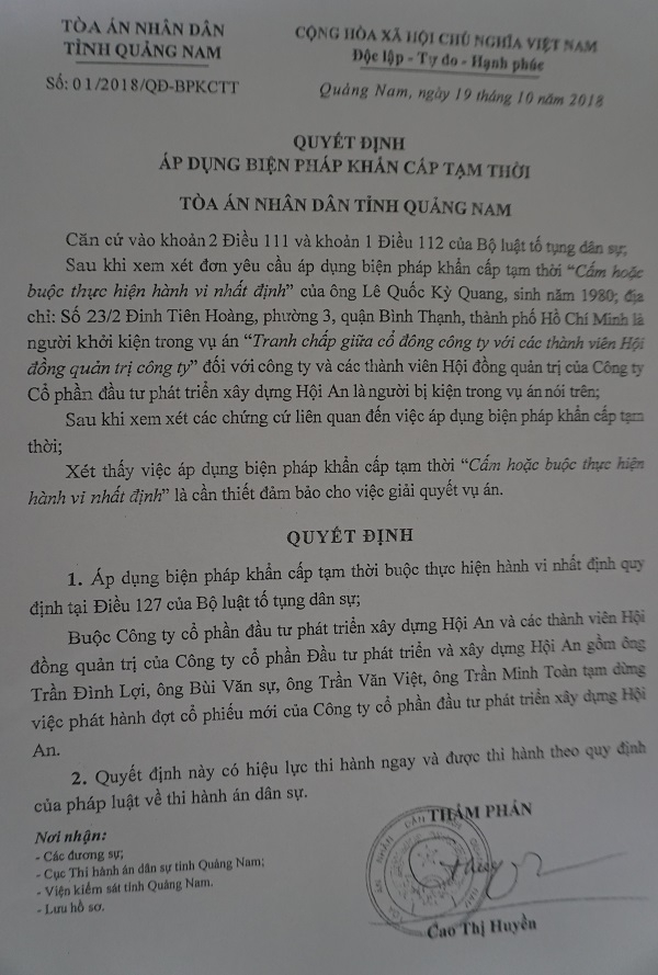 Văn bản của TAND tỉnh Quảng Nam quyết định áp dụng biện pháp khẩn cấp tạm thời buộc DIC Hội An và các thành viên HĐQT của công ty