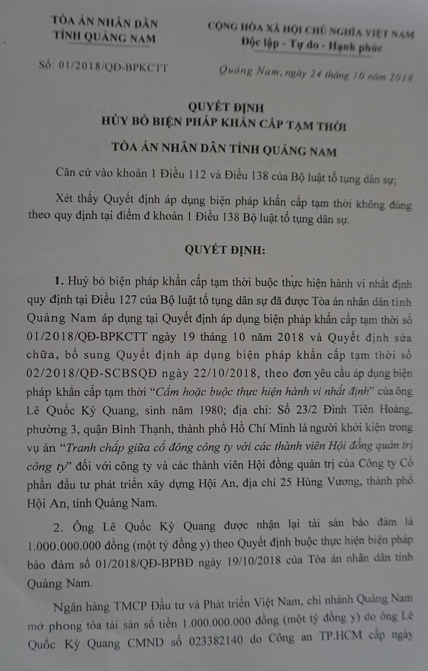 Chỉ sau một đêm, đến sáng ngày 24.10, TAND tỉnh Quảng Nam ban hành quyết định hủy bỏ biện pháp khẩn cấp tạm thời được Tòa này ban hành trước đó vào ngày 19.10.