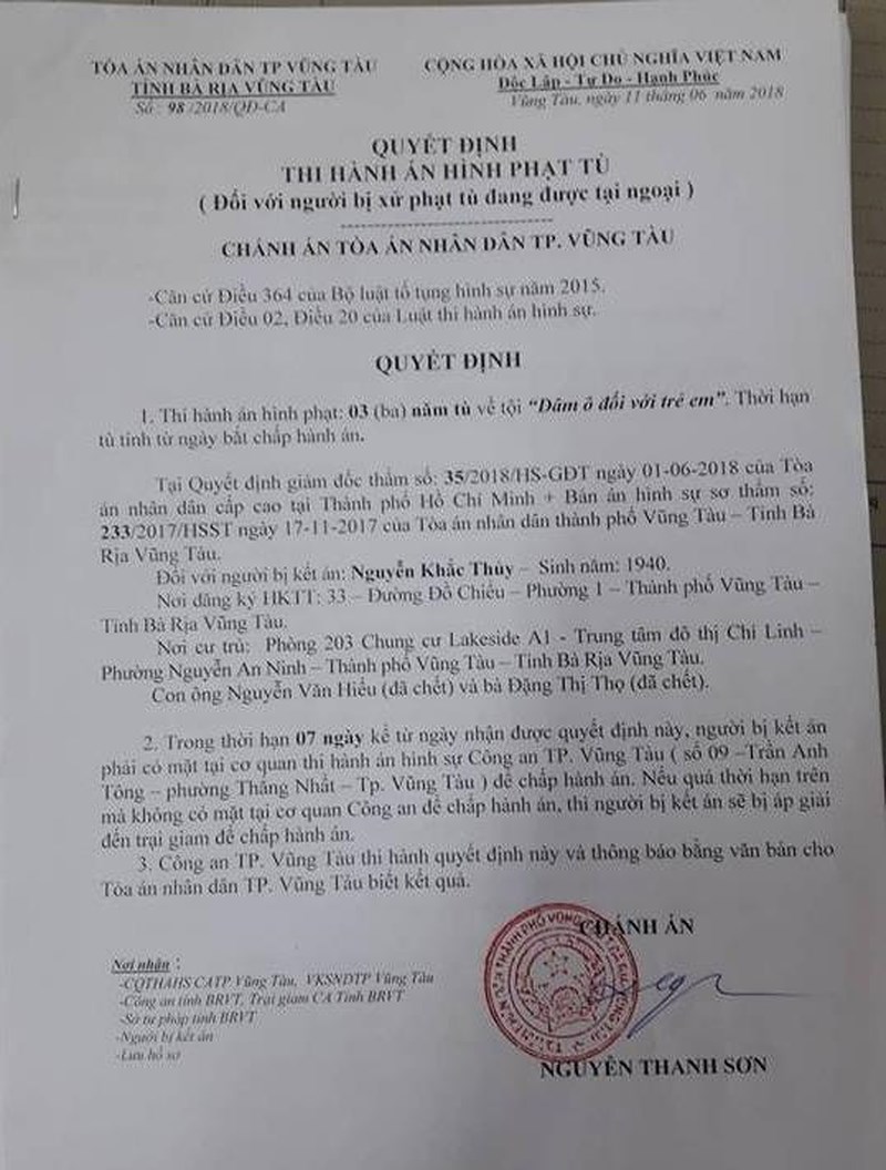 Trong thời hạn bảy ngày kể từ khi nhận được quyết định, ông Thủy sẽ phải có mặt để chấp hành án. Nếu quá thời hạn, ông Thủy không tự nguyện thi hành sẽ bị áp giải để THA tại nhà tạm giữ Công an TP Vũng Tàu.