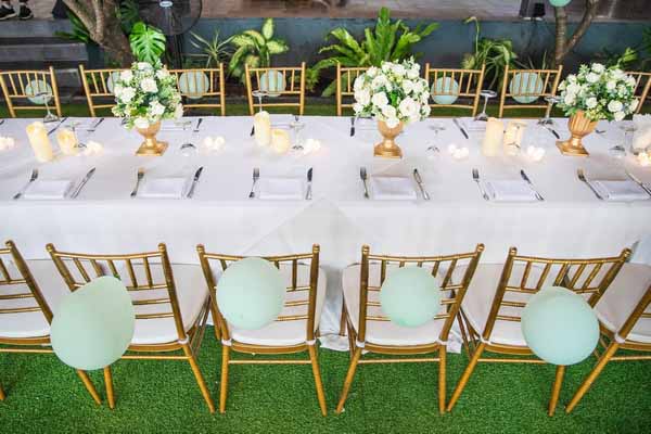 Lương Thế Thành và bà xã trang hoành không gian quanh bờ sông ngọt ngào, lãng mạn với tông trắng – xanh nhẹ nhàng. Thuý Diễm tự tay lên ý tưởng, chuẩn bị mọi thứ trang trí và cùng ông xã thực hiện hết mọi thứ để mong sao tạo cho con trai những ký ức đẹp trong sinh nhật đầu tiên của mình.