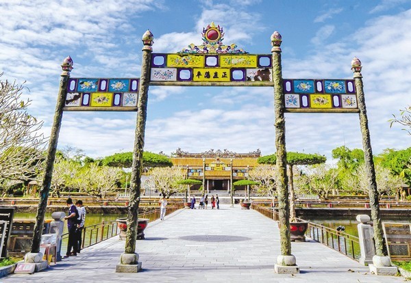 Trong kiến trúc, bắt đầu từ Ngọ Môn, đây là cổng lớn nhất trong 4 cổng chính của Hoàng thành Huế chỉ dành riêng cho vua đi lại hoặc đón tiếp các sứ thần. Cổng không chỉ là của hoàng thành mà còn là một lễ đài hướng về quảng trường lớn, nơi cử hành các cuộc lễ lớn của triều đình. Tiếp đến là điện Thái Hòa là nơi thiết triều và cũng là nơi tiếp sứ giả các nước. Chỉ riêng hai nơi này đã có hơn 10 hình tượng mặt trời được trang trí trên các bờ nóc kiến trúc và nghi môn (phường môn), trông cũng tương tự trang trí quốc huy ở các cơ quan công quyền như ngày nay. Mỗi lần đi điền dã ở Huế, nhiều nhà nghiên cứu đều không bỏ qua nơi này, bởi mỗi lần đến đều có cảm giác giống như lạc vào thủ phủ của vương quốc mặt trời. Ấn tượng nhất là hình ảnh mặt trời trên các nghi môn, bởi nó chẳng khác gì như đang chào đón mọi người đến với vương quốc.