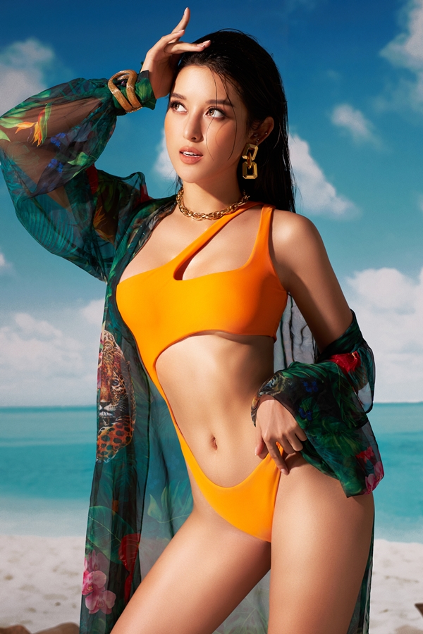 Huyền My diện bikini, tinh tế khoe dáng nuột nà cùng làn da rám nắng, khỏe khoắn. Trong bộ cánh rực rỡ màu cam, cô phô diễn cơ bụng săn chắc cùng đôi chân dài thẳng tắp. Người đẹp càng cuốn hút khi khoác hững hờ áo voan có họa tiết rừng nhiệt đới xanh mát. Cô khoe vầng trán cao, kết hợp biểu cảm tự tin, tạo dáng với đôi mắt “biết nói” gây xao xuyến.