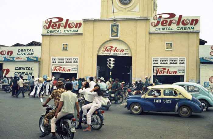 Cổng chính chợ Bến Thành năm 1967 với các pa-nô quảng cáo kem đánh răng Peplon. Ảnh: john Beck.