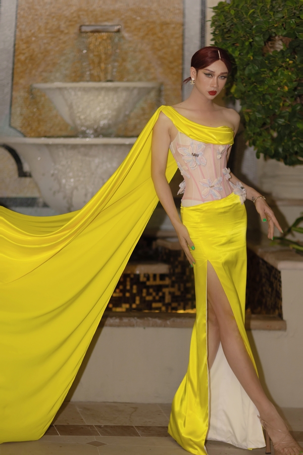 Bên cạnh BB Trần, Hải Triều cũng không kém cạnh trong thiết kế màu vàng nổi bật nhưng đầy tinh tế. Với lợi thế sỡ hữu đôi chân dài, chiều cao cũng như thân hình cân đối đến phái nữ còn ghen tị, anh tự tin mang đến một phần catwalk đầy thần thái và xuất sắc.