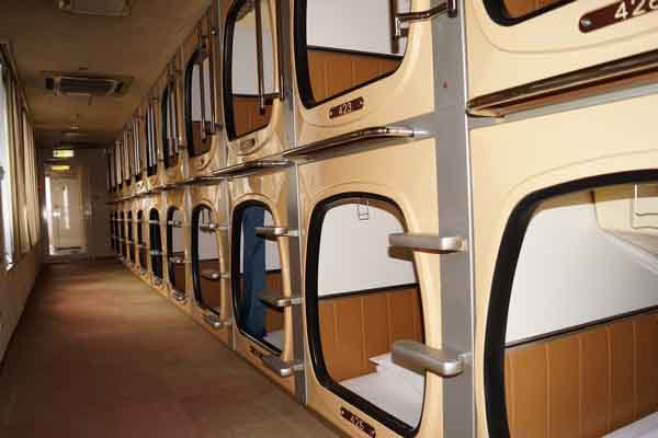 Giường thực chất là khoang ngủ, thiết kế giống như con nhộng, có hai tầng, lắp đặt trong căn phòng lớn. Khách ngủ bên trong những chiếc giường này. Ngoài bộ trải giường, khoang ngủ còn được trang bị hệ thống chiếu sáng, máy lạnh, quạt thông gió, đồng hồ báo thức, radio và tivi nhỏ (treo trên trần nhà). Tất cả đều được sắp xếp theo chức năng, thuận tiện cho khách sử dụng. Lối vào phòng thường ngăn cách với bên ngoài bằng rèm hoặc cửa chắc chắn để tạo sự riêng tư, có thể khóa từ bên trong.Tuy nhiên, không có cách âm nên người ngủ trên giường có thể nghe tiếng động chung quanh, ví dụ như tiếng bước chân di chuyển xuống lối đi, đồng hồ báo thức kêu trong các khoang khác hoặc tiếng ngáy của ai đó.