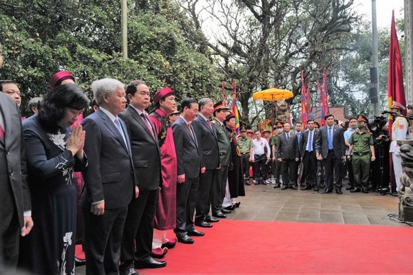 Chủ tịch nước Võ Văn Thưởng cùng các vị đại biểu thành kính dâng hương tưởng niệm các Vua Hùng năm Quý Mão 2023