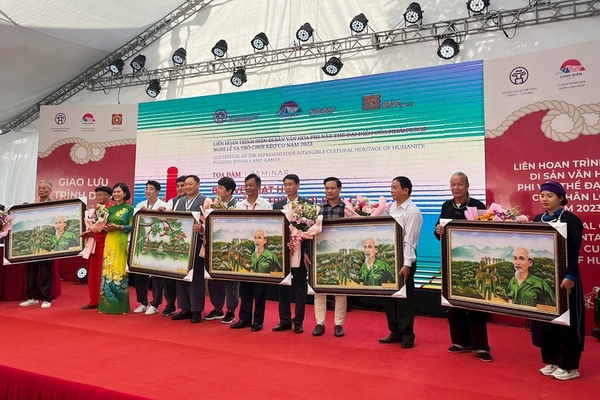 Đại diện Hội Di sản văn hóa Việt Nam tặng quà lưu niệm cho các đơn vị.