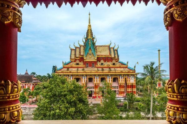 Ngay từ khi đặt chân vào chùa, du khách sẽ khá “choáng” trước sự đồ sộ và hào nhoáng của khu vực chánh điện với rất nhiều hoa văn và bích họa được chạm trổ kỳ công trên những bức tường, cây cột hay mái chùa kiểu xếp tầng. Những hoa văn, phù điêu trang trí mang đậm dấu ấn Angkor, từ họa tiết hình cánh sen với những đường cong dịu dàng, thanh thoát đến hình hoa thị mạnh mẽ, cân đối, luôn luôn hiện hữu trên từng ô cửa, hàng hiên.