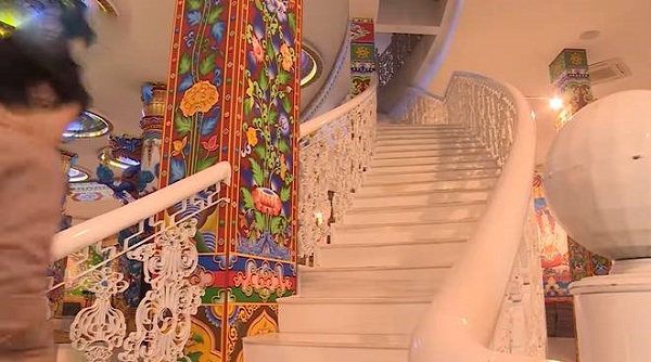 Cầu thang nối giữa các tầng trong bảo tháp tượng trưng cho con đường tiến đến giác ngộ, mỗi bậc thang tương ứng với từng thứ lớp và quả vị tu tập của hành giả. Lên hết cầu thang thứ nhất là tầng hai của đại bảo tháp, điểm đặc biệt ở đây là lan can được gắn nhiều kim luân chuyển chú. Khách hành hương vừa đi nhiễu vừa chuyển chú cầu nguyện để viên mãn mọi tâm nguyện. Sau khi đi hết một vòng kim luân ở lan can tầng hai, phật tử sẽ theo các cửa đi vào không gian bên trong, nơi thờ Ngũ Trí Phật. Có năm pho tượng Ngũ Trí Phật được mô phỏng theo mô hình Mandala thể hiện năm loại trí tuệ của Phật. Phần vòm trần của đại bảo tháp là bức họa phù điêu tám tướng Phật hành đạo vô cùng sinh động.