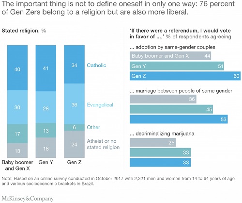 Một số liệu khảo sát năm 2017 tại Brazil cho thấy, 70% cá nhân thế hệ Gen Z sẵn sàng tuyên bố đạo giáo mà họ đang theo đuổi. Tuy nhiên, thay vì hoàn toàn từ chối những tổ chức còn lại, Gen Z có xu hướng lắng nghe và tiếp cận tương tác để từ đó tiếp thu những thông tin, kiến thức mà họ xem là phù hợp, bổ ích với họ.
