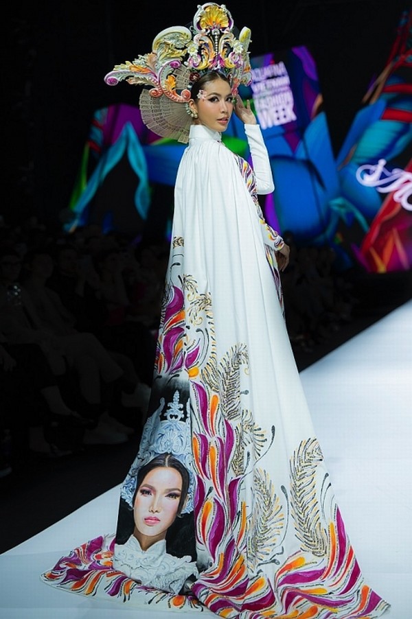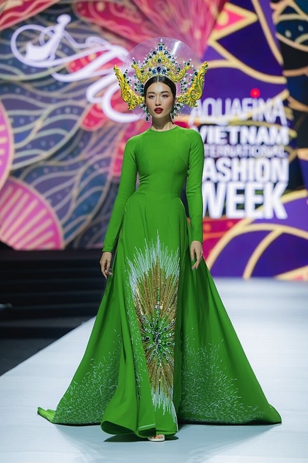 Người mẫu Hương Ly đảm nhận vai trò mở màn cho show diễn của NTK Đặng Trọng Minh Châu. Xuất hiện trên sân khấu, chân dài quê Gia Lai gây ấn tượng bởi những bước catwalk uyển chuyển trong tà áo dài xanh lá. Điểm nhấn của bộ trang phục là hình ảnh con chim lớn với phần khung phía sau được thực hiện đẹp mắt. Dù thiết kế được đánh giá hoành tráng, gây khó khăn cho người mẫu khi di chuyển song Hương Ly cho thấy bản lĩnh của mình khi mang đến phần mở màn trọn vẹn cho người xem.