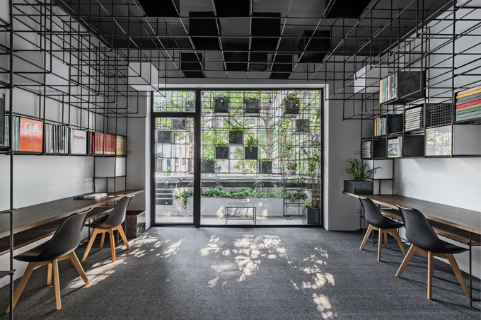 Nhóm kiến trúc sư bắt đầu tìm kiếm căn hộ tập thể cũ có khoảng ban công bỏ trống, cải tạo thành văn phòng làm việc. Một giàn thép tái chế gồm nhiều hộp vuông rỗng để đặt cây xanh, bể cá, có thác nước chảy liên tục. Giàn thép trở thành màng chắn bụi, nắng, chống mưa tạt, ngăn chặn được đột nhập từ bên ngoài.