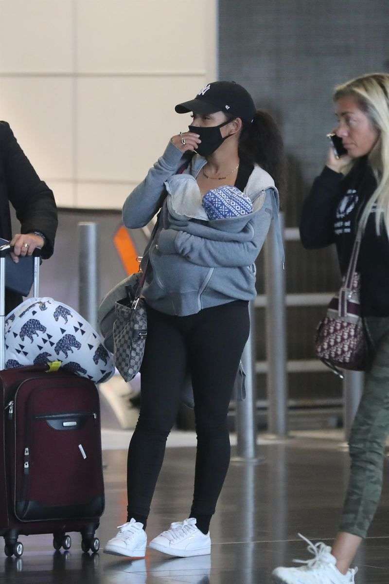 Nữ ca sĩ, diễn viên Christina Milian đeo khẩu trang màu đen đồng điệu với trang phục khi ra sân bay.