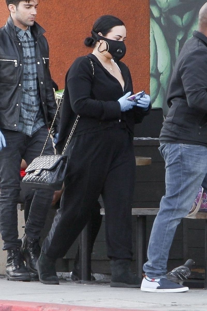 Demi Lovato diện set đồ đen toàn tập, đeo khẩu trang chống độc và găng tay khi ra ngoài. Cô bị người hâm mộ nhận xét ‘phát tướng’ so với trước kia.