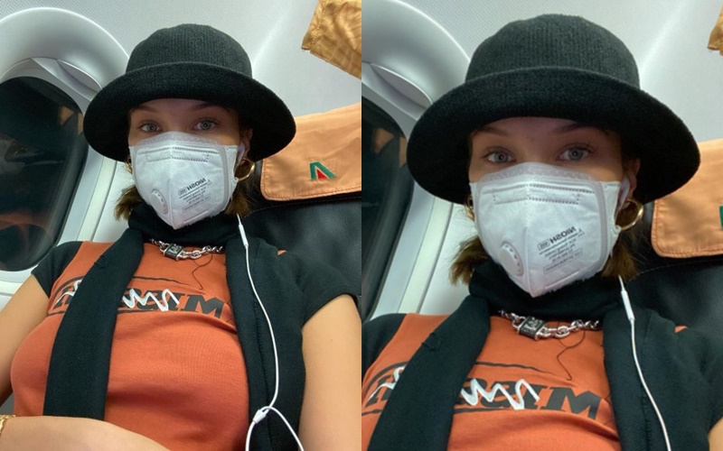 Bella Hadid chọn khẩu trang chống độc nhưng vẫn ‘lên đồ’ chất lừ khi đi máy bay.