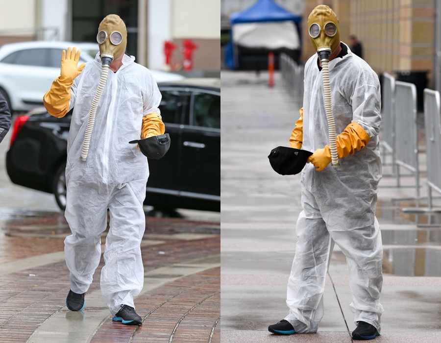Sao nam Howie Mandel cùng với bộ trang phuc ‘kín cổng cao tường’. Anh còn sử dụng mặt nạ chống độc kết hợp găng tay cao su để bảo vệ sức khỏe khi ra ngoài.